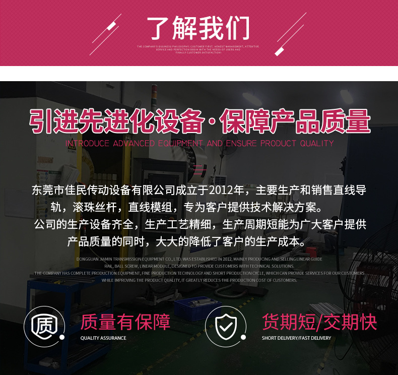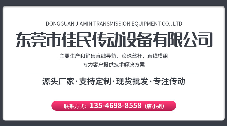 东莞市佳民传动设备有限公司成立于2012年,主要生产和销售直线导轨,滚珠丝杆,直线模组。