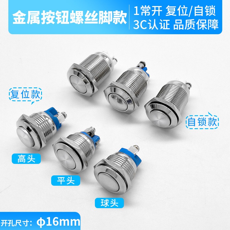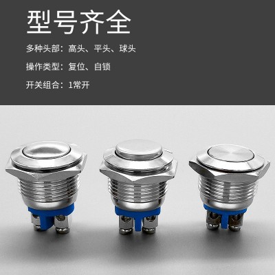 16mm金属按钮开关高平球头点动自复位防溅水两只螺丝脚 汽车喇叭