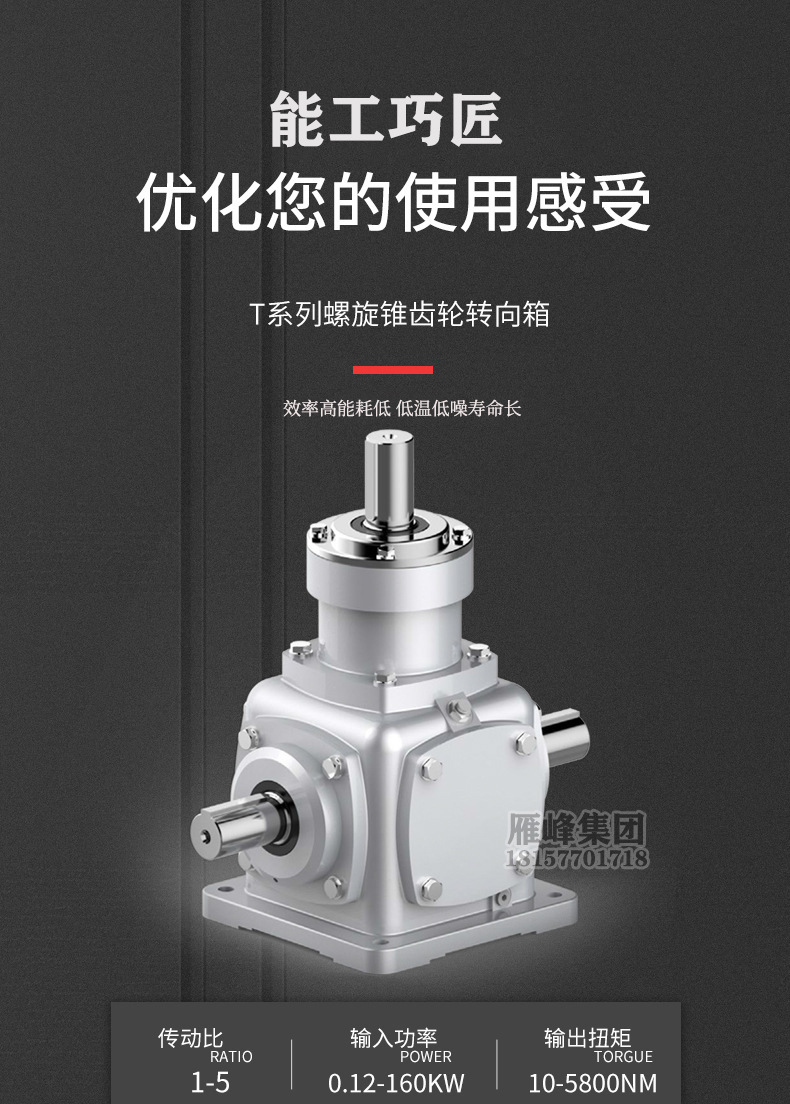 T系列螺旋锥齿轮转向箱,传递动力大,能适应正反转,振动小,噪音低。