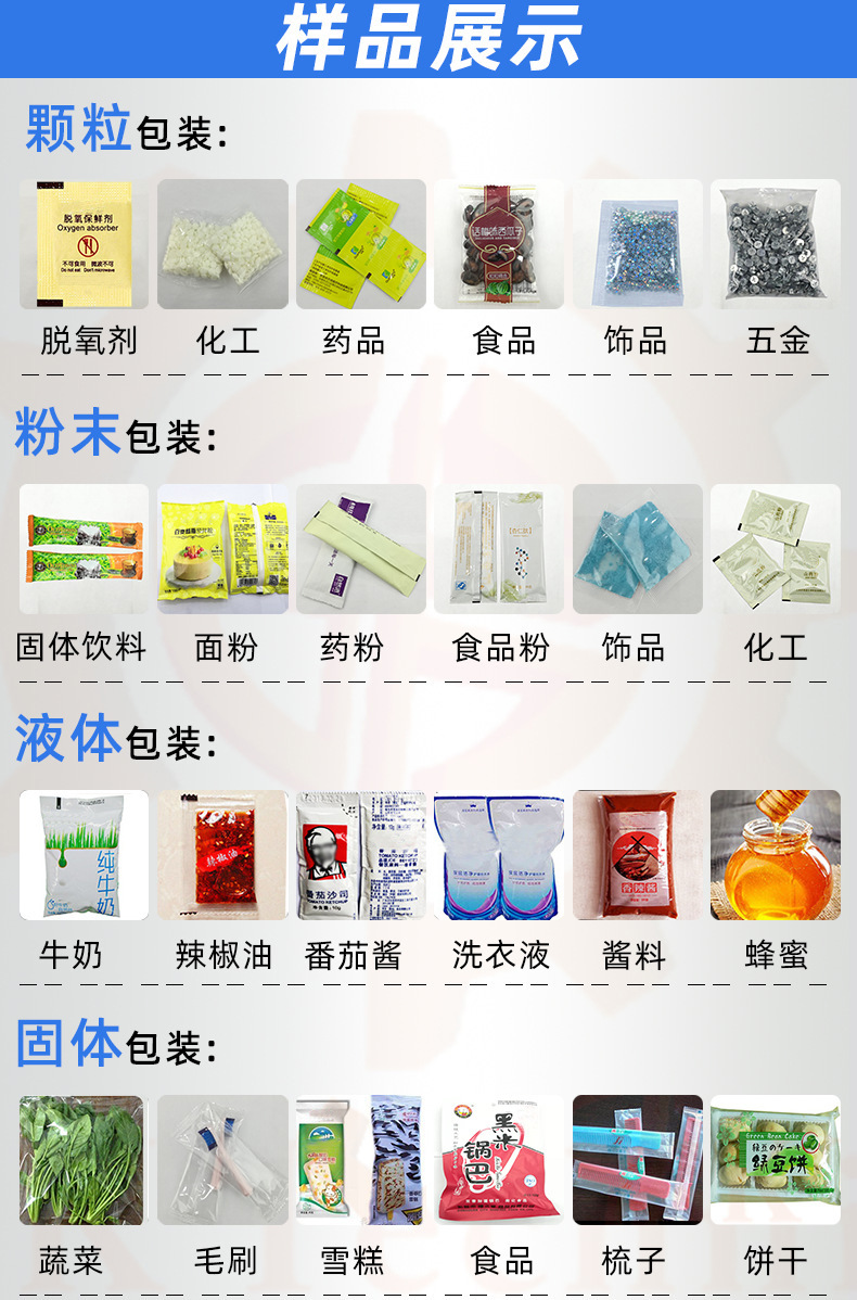 | 物料类型 | 粉剂 | 售后服务 | 保修一年 终身维护 | 规格 | 颗粒包装机,粉末包装机,多头秤包装机,枕式包装机,五金配件包装机,茶叶包装机,大袋颗粒包装机,螺杆计量包装机 |