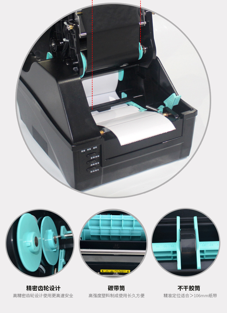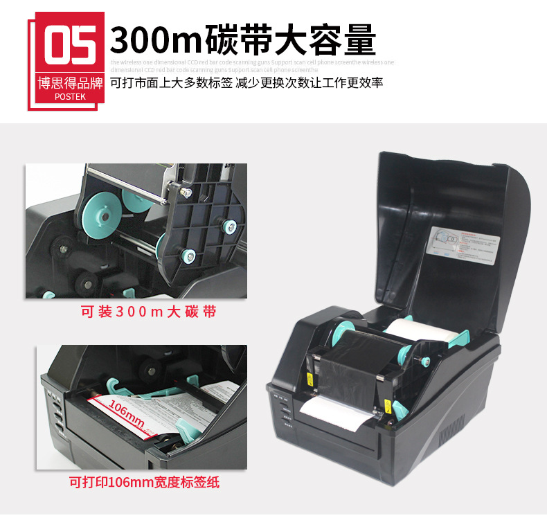 热敏、热转印双模式,适合用于打印热敏纸、铜版纸、PET、洗水麦等各种材质标签。
