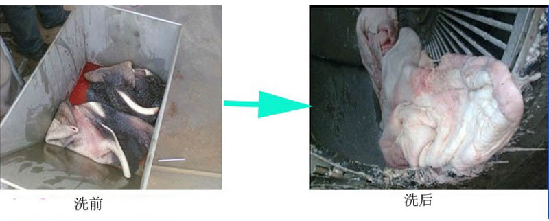 将胃从进料输入放入机器,滚筒旋转,有摩擦块与胃之间的摩擦。水喷溅洗胃,洗完后(约4-5分钟),机器关闭然后把产品拿出来。