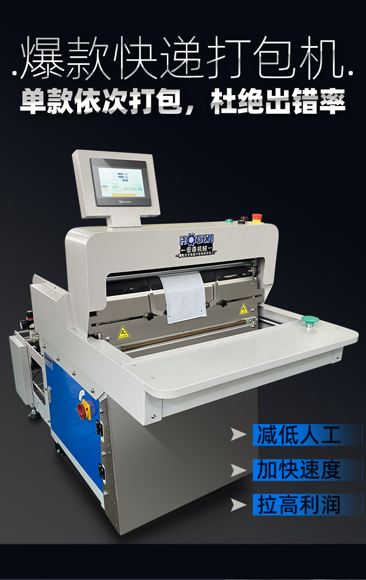 此产品为快递电商专用快递袋包装设备,全自动出袋、打印、贴单一体化,高效率,杜绝错单。