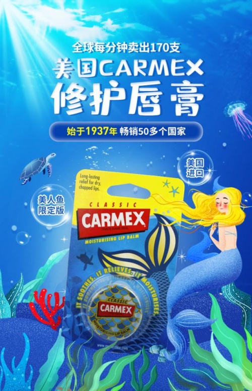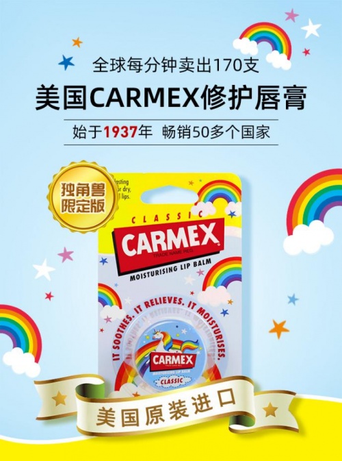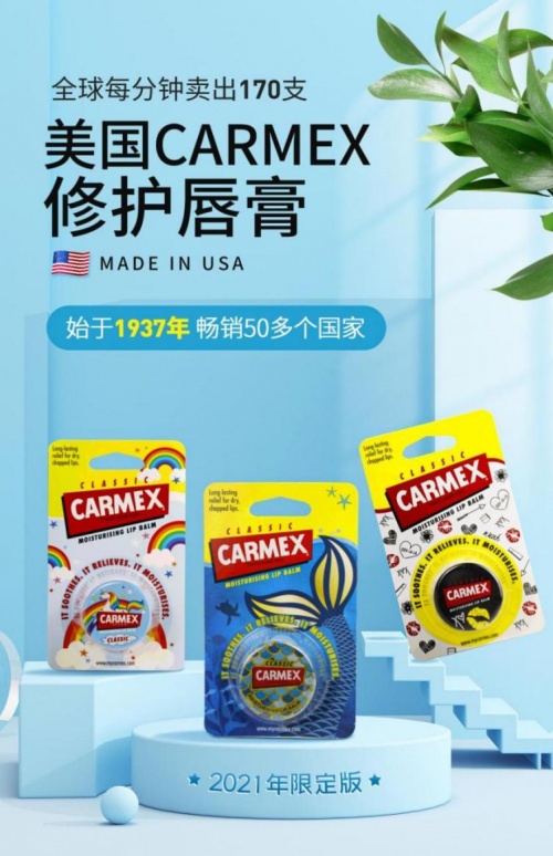 CARMEX自1937年在美国诞生以来,将产品销售至全球50个国家和地区。更是从1990年起,连续22年被美国医药杂志《Pharmacy Times》选为全美药剂师推荐的护唇膏品牌。CARMEX能在美国唇膏市场常居前三甲之位,除了它过硬的品质,还有它多元的限定包装玩法。在英国、墨西哥等国家几乎每年都会更新一版限定包装。这些限定包装,除了好看,更成为了年轻人的“社交货币”,在INS等国外社交媒体上广受欢迎!
