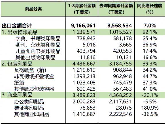 相关印刷品主要子项出口,字典书籍类印刷品7.29亿美元(同比增长25.4%),期刊杂志类印刷品501.8万美元(同比增长36.9%),儿童图画书类印刷品4.94亿美元(同比增长17.4%),瓦楞纸盒(箱)12.20亿美元(同比增长34.2%),非瓦楞纸折叠纸盒13.93亿美元(同比增长44.7%),纸袋10.23亿美元(同比增长37.3%),办公类印刷品20.00亿美元(同比下降5.5%),票证类印刷品7885.3万美元(同比增长180.9%),其他商业印刷品14.11亿美元(同比下降36.5%)。