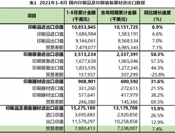 表1 2021年1-8月 国内印刷品及印刷装备器材进出口数据