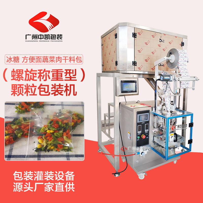 全自动食品颗粒包装机对于形态均匀的小颗粒产品可以采用量杯计量,具有包装速度快计量误差小的特点,对于非均匀形态的固态调味料可采用螺旋计量秤称重,每个形态的物料各自称重后下料包装,实现多物料混合包装。