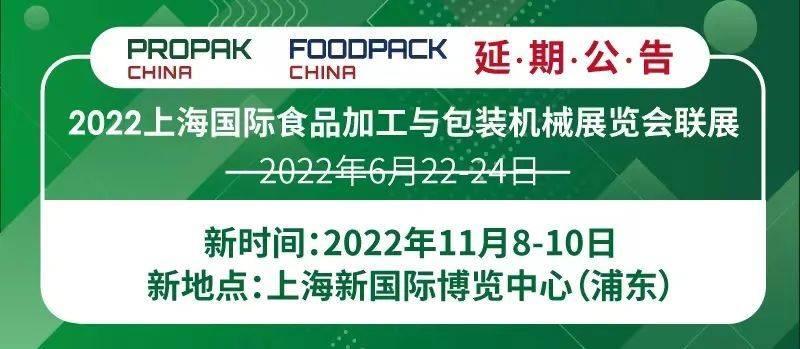 根据国家疫情防控办最新发布的防控措施,考虑到所有参展人员的健康与安全,经过慎重考虑,我们决定将由上海博华国际展览有限公司、中国包装和食品机械有限公司、中国食品和包装机械工业协会主办,原定于2022年6月22-24日在国家会展中心(上海)举办的2022上海国际食品加工与包装机械展览会联展延期至2022年11月8-10日在上海新国际博览中心举办。