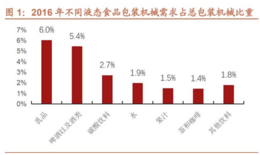 按照下游产品,可将液态食品包装机械分为乳品包装机械、饮料包装机械和酒类包装机械。乳品微生物种类多、数 量大,在生产包装过程中易被污染,甚至造成杂菌污染、噬菌体感染等,因此对包装机械的要求高于饮料和酒类。 根据 Freedonia 的数据,饮料是液态食品包装机械最大的应用领域,2016 年包装机械需求中约 9.3%来自饮料(包 括碳酸饮料、水、果汁、茶和咖啡、其他饮料),乳品和酒类分别占 6%、5.4%。