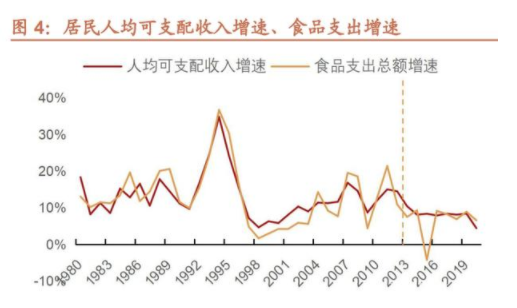 食品饮料包装机械的核心驱动因素是人均可支配收入。我们根据居民最终消费支出及恩格尔系数计算得到食品消费 规模,并将其增速与人均可支配收入增速进行对比,发现二者保持几乎相同的走势,因此食品消费规模的直接影响 因素是收入水平。我国居民人均可支配收入于 2013 年以前保持高速增长,食品饮料投资规模快速扩大,因此 2006- 2013 年间包装机械需求从 182 亿元增长至 569 亿元,CAGR 达到 17.7%;2014 年起,居民人均可支配收入增速回 落至个位数,相应地,食品支出总额自 2013 年起保持不超过 10%的低速增长,食品与饮料制造厂商投资意愿减弱, 近几年其固定资产投资完成额增速明显放缓甚至出现负增长,对应我国包装机械市场规模的稳定增长阶段,2013- 2018 年 CAGR 仅为 3%。