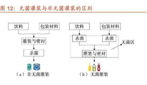 无菌灌装和非无菌灌装的关键区别在于是否对包装材料进行单独灭菌。传统的非无菌灌装技术是将产品灌装至包装 容器,密封后进行杀菌,使产品达到商业无菌状态;无菌灌装技术诞生于 20 世纪 30 年代,是将产品及包装容器分 别进行灭菌后,在无菌环境下进行灌装,并完成密封,使产品免受微生物污染、延长产品货架期。包装材料灭菌是 无菌灌装工艺中最关键的一步,要求灭菌过程既要有效地杀灭包装材料上的微生物,清洗后无化学试剂残留,还要 求灭菌过程对于包装材料的物理、化学性质无影响。包装材料的杀菌方式主要是过氧乙酸湿法杀菌、过氧化氢干法 杀菌。以 PET 瓶灌装为例,传统 PET 无菌灌装生产线多采用过氧乙酸法,杀菌效率高,但容易造成溶剂残留,且 需要用大量无菌水冲洗,能耗较高;目前国内 PET 无菌灌装产线主要采用过氧化氢法,能够对瓶子/瓶坯内外部同时 杀菌,且无需无菌水清洗,几乎无废水产生,能耗较低;国外龙头企业如德国 KRONES、法国 SIDEL 均使用瓶坯 干法杀菌,杀菌对象为瓶坯而非瓶子,避免了瓶子收缩的风险,且杀菌效率更高,灭菌工艺更加可靠和稳定。