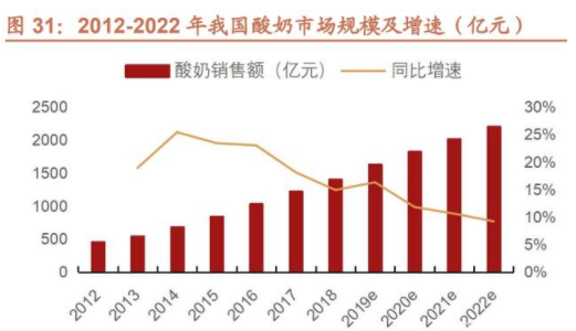 酸奶市场保持高速增长,常温酸奶表现突出。酸奶是乳制品中另一富有活力的产品,能够改善消化,满足新生代消 费者释放压力、舒缓情绪等非功能性诉求,因此市场规模快速增长。根据 Euromonitor 的数据,2012 年我国酸奶制 品销售额为 456 亿元,预计到 2022 年,酸奶销售额将增长至 2200 亿元,2012-2022 年 CAGR 为 9.2%;酸奶消费 在整个乳品市场中的占比从 2014 年的 20%跃升到 2019 年的 36%,预计到 2024 年将进一步提升至 42.2%。与白奶 相似,酸奶也可分为常温酸奶与低温酸奶,常温酸奶在发酵后经过高温热处理,杀灭了酸奶中的乳酸菌及其他菌种, 经无菌包装而成,保质期较长,代表产品为安慕希、纯甄、莫斯利安;低温酸奶只在发酵前进行了巴氏杀菌处理, 乳酸菌及其他菌种尚未被完全消灭,故低温酸奶需在 2-6℃环境下保存,保质期较短。Mintel 的数据显示,常温酸奶 引领了近 5 年的增长,年均增速保持在 45.8%的高水平,远超低温酸奶和乳酸菌饮料。2017 年,常温酸奶超越低温 酸奶,成为酸奶市场的第一大品类。2019 年,常温酸奶的市场销售额已接近低温酸奶和乳酸菌饮料的总和。
