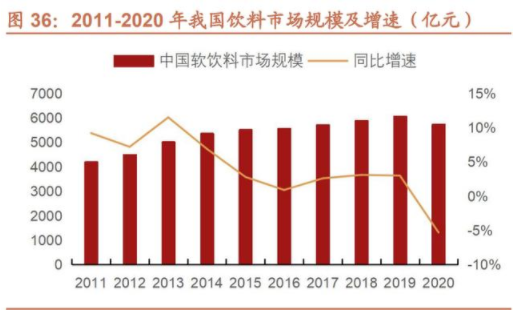 饮料消费总量停滞增长,健康、无添加产品景气度高涨。饮料市场经历了快速发展后趋于成熟,总量来看,近 5 年 来产销量并未有明显增长,2020 年市场规模为 5735.49 亿元,同比下降 5.3%,产量为 1.63 万吨,同比下降 8%。 细分品类来看,包装饮用水拥有健康安全、便于携带等优点,成为饮料行业中最大的细分市场,15-20 年 CAGR 5.99%,表现出了良好的增长潜力;即饮茶、碳酸饮料、果汁由于传统产品含糖量高,与健康生活相悖,零售额不 断下降,无糖茶、无糖气泡水、NFC 果汁等健康新品类贡献了主要增量;功能饮料是指通过调整饮料中营养素的成 分和含量比例,在一定程度上调节人体功能的饮料,能量饮料、运动饮料均属功能饮料,2020 年合计市场份额约 10%,饮用场景也从运动健身延伸到社交、娱乐,增速居于前列;即饮咖啡同样呈现高速增长之势,但总体规模较 小。因此,随着消费者健康意识的增强,“天然无添加”已经成为消费者,尤其是年轻消费者选购饮品的主要考虑因 素,推动包装饮用水、无糖饮料、无糖茶、功能饮料等品类消费规模显著增长,预计未来较长一段时间内消费者对 饮品的核心诉求仍是健康,包装水、功能饮料、无糖饮料等细分产品销售规模将继续保持较高增速。