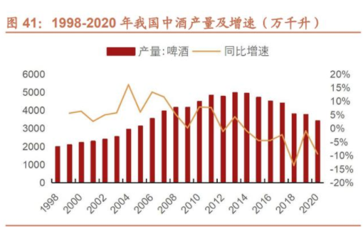 啤酒行业已步入存量市场,中高端啤酒为行业新增长点。我国啤酒产量于 2013 年达到 4982.79 万千升的高点,此 后不断下降,2020 年降至 3411.11 万千升,主因为消费市场个性化趋势导致替代品增加、人口老龄化趋势导致消费 人群减少,这两个趋势短期内难以逆转,因此啤酒消费总量将在较长一段时间内保持稳定甚至负增长。消费升级使 高端啤酒成为行业新的增长点,2011-2018 年高端啤酒销售额增速为 20%-35%,低端啤酒 销量占比由 89%下降至 76.5%。GlobalData 预测到 2023 年,中国中高端啤酒的消费总量将达到 102 亿升,市场消 费总额预计将达到 627 亿美元,中高端啤酒市场在未来具备着巨大的潜力。