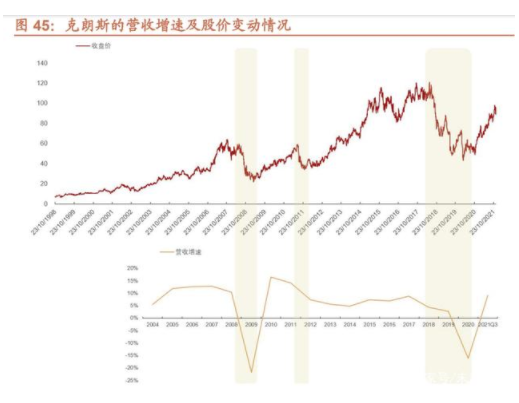 在延伸产品线的过程中,公司营收规模持续扩大,行业集中度提升。除了 2009 年、2020 年分别受到金融危机、新 冠疫情冲击之外,克朗斯营收连续多年保持正增长,2020 年总营收为 33.23 亿欧元,其中包装设备约 28 亿欧元, 加工处理设备约 5.25 亿欧元。全球市场份额也从 2004 年的 6.6%提升至 2014 年的 9.3%,反映了行业集中度的提 升,2018 年由于营收增速放缓,市场份额下降至 7.6%。对比营收增速、净利率及股价表现,我们发现虽然克朗斯 的营收并未出现爆发式增长,但在营收增速超过 5%的年份,净利率处于 4%-6%的较高水平,股价保持上涨趋势, 而当营收增速明显下降甚至出现负增长时,净利率明显下降,股价同时下跌。总体来看,截至 2021 年 12 月 3 日, 克朗斯股价较上市时上涨近 13 倍,股价趋势与业绩变动情况基本一致。