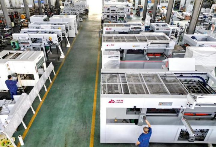 7月13日,河北省玉田县一家印刷包装机械制造企业的工人在生产线上工作(无人机照片)。 目前,在河北省玉田县,各家印刷包装机械制造企业正开足马力生产,赶制订单,车间内一片忙碌。 印刷包装机械制造产业是玉田县的传统特色产业。近年来,玉田县投入资金对印刷包装机械制造企业进行技术改造,推动该产业向高端化、智能化发展,引导企业加强科技创新能力,延伸上下游产业链。目前,玉田县已发展印刷包装机械制造产业上下游企业380余家,年产值超120亿元。 新华社记者 牟宇 摄