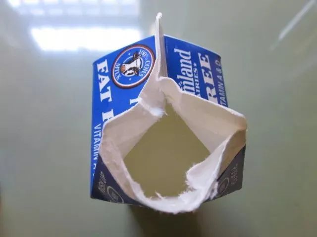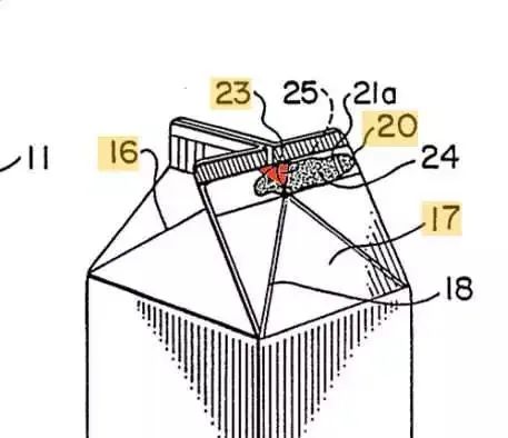 而对于装牛奶的屋形纸盒,也有专利提供了思路更加简单的解决方案:可以在下图中的位置留下一小块密封较弱的区域,方便打开[2]。