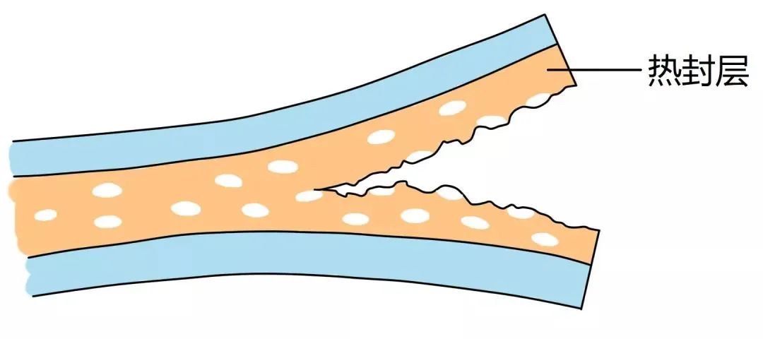 内聚剥离示意图,白色的部分是混入的另外一种聚合物(通常是聚丁烯),它能让热封层更容易从内部开裂 | 作者绘制