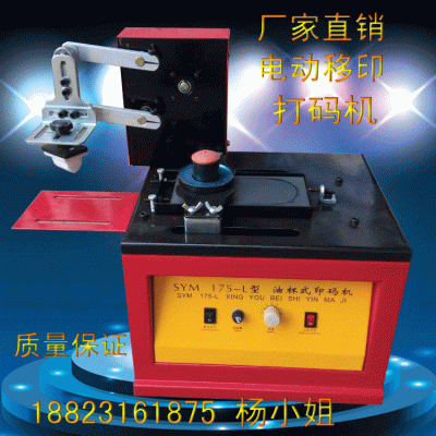 电动油墨移印机适用于食品、罐头、饮料、化妆品、电器、制药等行业的各类瓶,罐,杯,盒等包装上产品打印出产日期、保质期、批号条码、图案等,可在各种材料,不同面上印刷,印刷速度快,字体美观、清晰。打印后的效果达到喷码机喷印效果。凹版移印板分方形板和圆形活动板两种,可定制各种所需要的印刷字符。电动油墨移印机分为圆盘油杯型、长板油杯型、方板刮刀型三种,可以在金属、塑料、玻璃、陶瓷、薄膜、尼龙等产品上的任意部位凹凸不平面上打印。本机介绍:80/80E电动台式凹版油墨打印机,机型小巧,不占空间,外形美观,适合于中小型加工厂,该机使用方便,操作简单,质量可靠,可在不同形状的凹凸面上印刷。本品的减速器不易磨损,使用寿命长,个机件配合紧密,午间隙,并采用电子控制无级调速功能,可根据操作者的熟练程度调整适宜的印刷速度进行承印操作.
